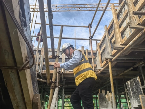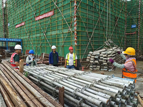 來到3樓頂板上方,工人們正搭建防護(hù)網(wǎng)。“他們是這個工作面的開荒者,危險系數(shù)最大。”葉劉杰說,只有防護(hù)網(wǎng)搭建完畢,木工、鋼筋工等不同班組才能陸續(xù)入場施工。仔細(xì)查看每道工序,并對當(dāng)班工人叮囑一番注意事項后,葉劉杰才放心離開。