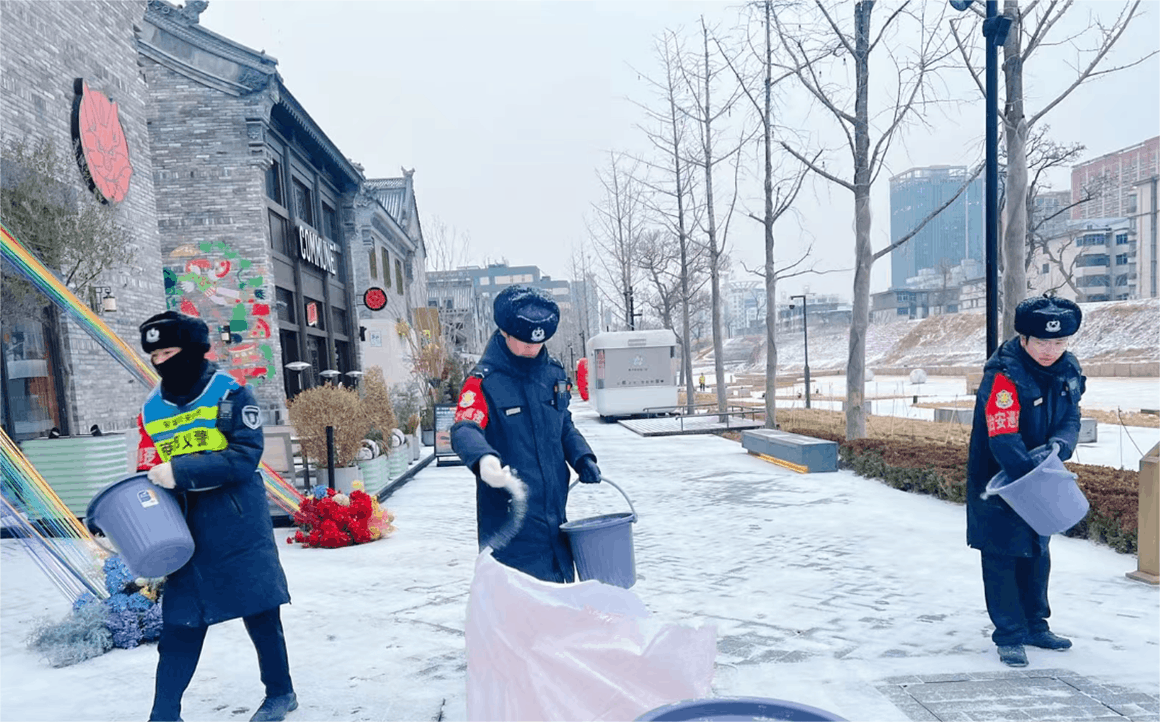 為保障亳都·新象街區(qū)安全運行,商都發(fā)展公司提前部署應對舉措。備足除雪物資,組織物業(yè)連夜掃雪除冰;通過商戶群、街區(qū)循環(huán)廣播推送防寒防凍、防滑提醒;安排工程人員對設(shè)施設(shè)備做足保溫防護,全方位排查隱患,為商戶與市民筑牢安全屏障。