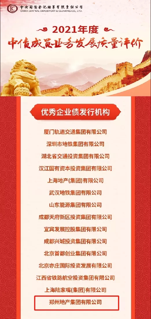 2022年1月4日,鄭州地產(chǎn)集團(tuán)獲評中央國債登記結(jié)算有限責(zé)任公司(以下簡稱中央結(jié)算公司)發(fā)布的2021年度中債成員業(yè)務(wù)發(fā)展質(zhì)量評價“優(yōu)秀企業(yè)債發(fā)行機(jī)構(gòu)”。