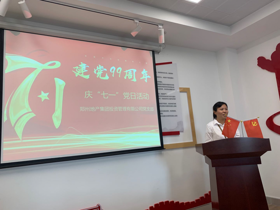 為熱烈慶祝建黨99周年,激發(fā)公司廣大黨員的責任感、榮譽感和使命感,鄭州地產集團投資管理有限公司黨支部開展慶祝建黨99周年·“七一”黨日活動。在黨的生日這天,組織全體黨員重溫初心承諾、學習理解黨的文化內涵、講述家風傳承故事。